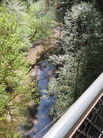 It is a stable bridge. Not much sway in it. Mostly you feel it in the handrails. And, as you might expect, you get some spectacular views of the creek.